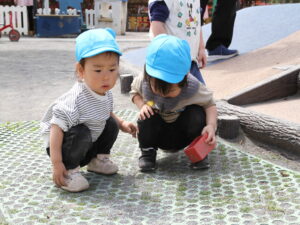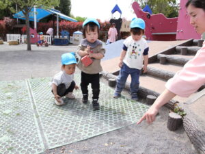 1歳児クラスのお友達が園庭でなにやら散策中…